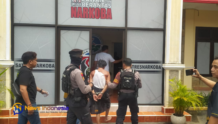 Tak lama berselang, dengan tertatih seorang pria berkaos kutang mengenakan sarung hitam dikeler anggota kepolisian memasuki kantor Satnarkoba.